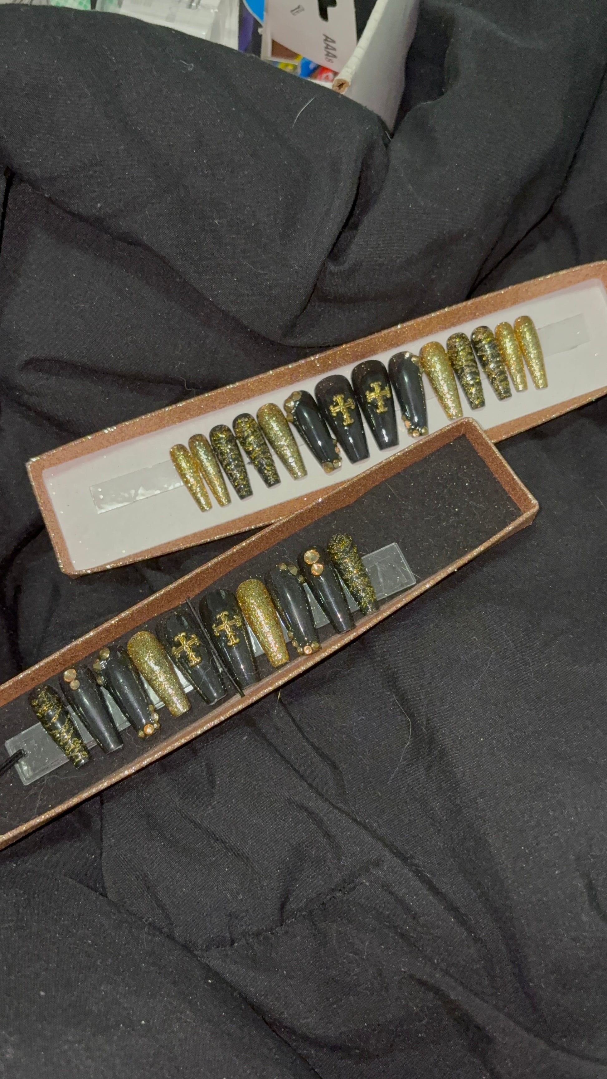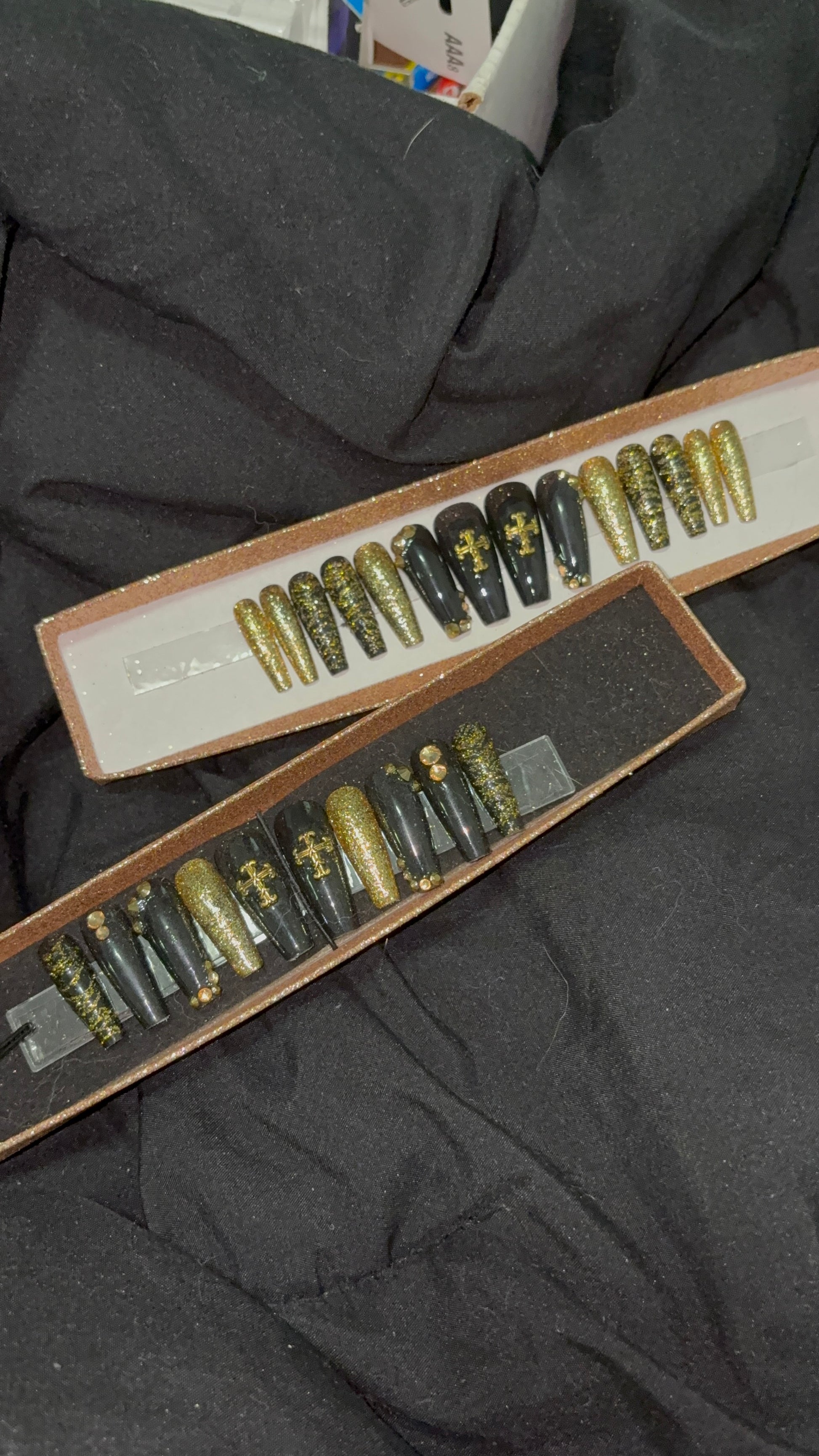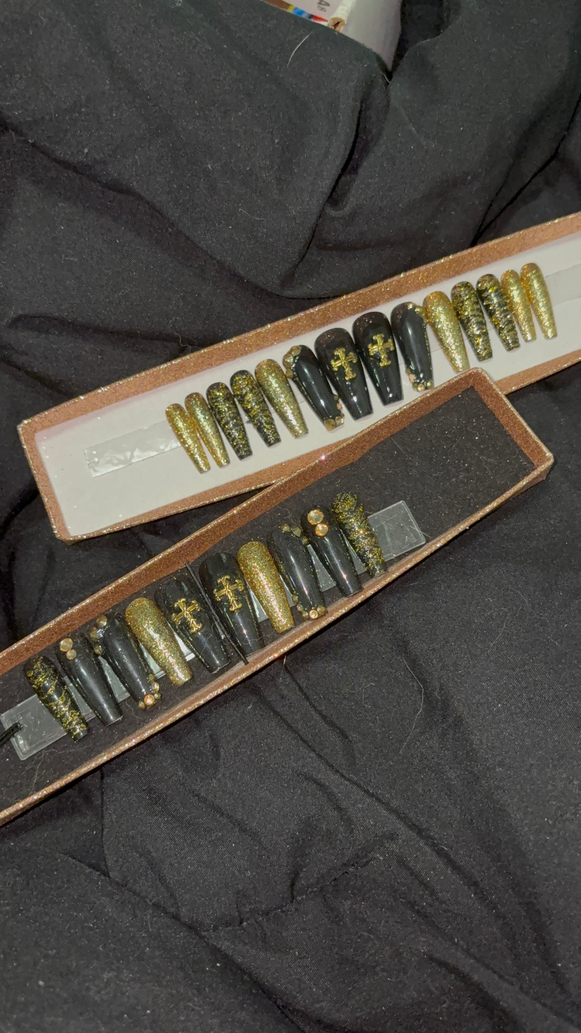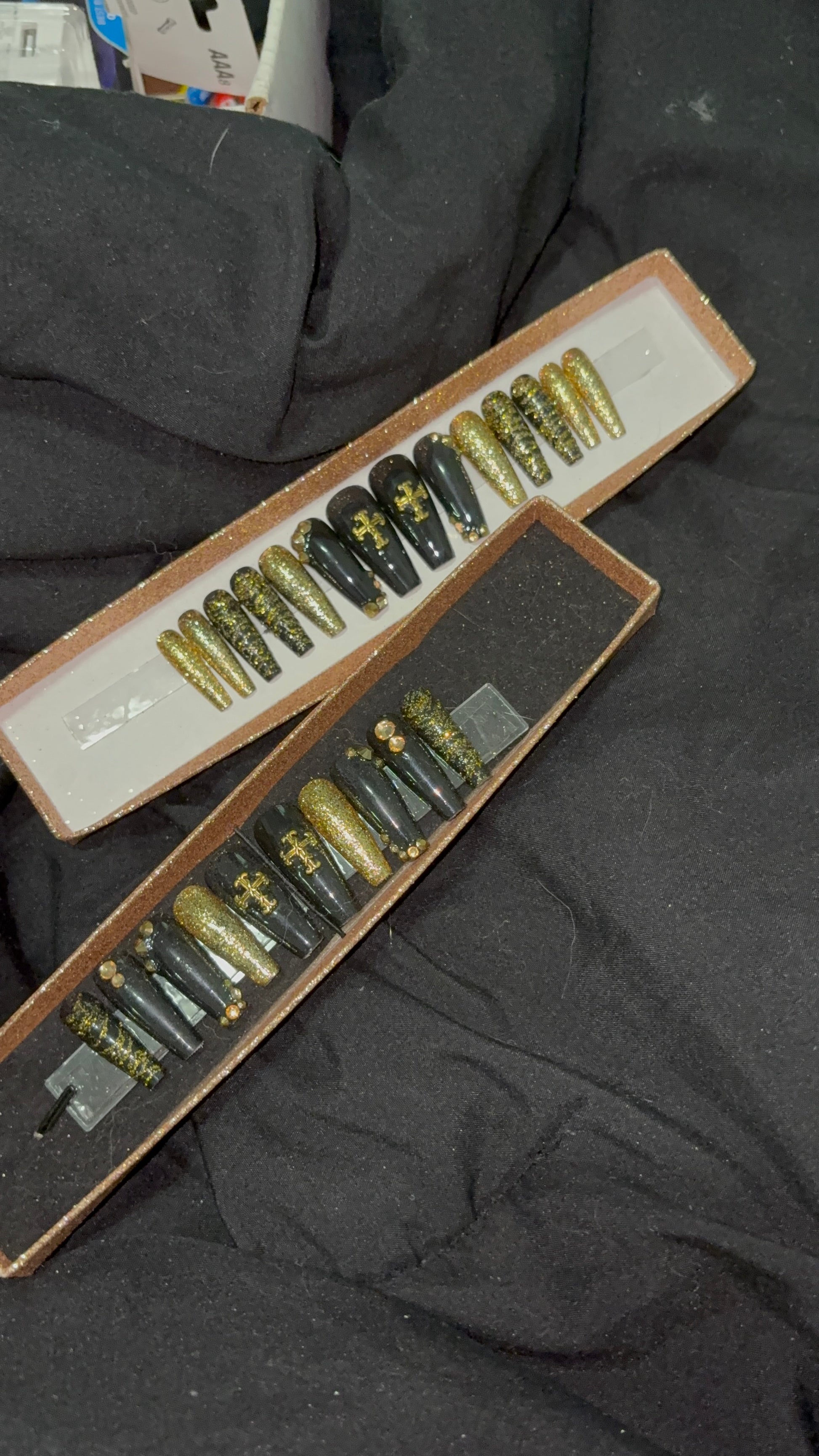 Turn heads with these bold black nails, adorned with gold accents, sparkling bling, and eye-catching hems. Perfect for making a statement, this set is all about luxury, glam, and showing off your fierce style.