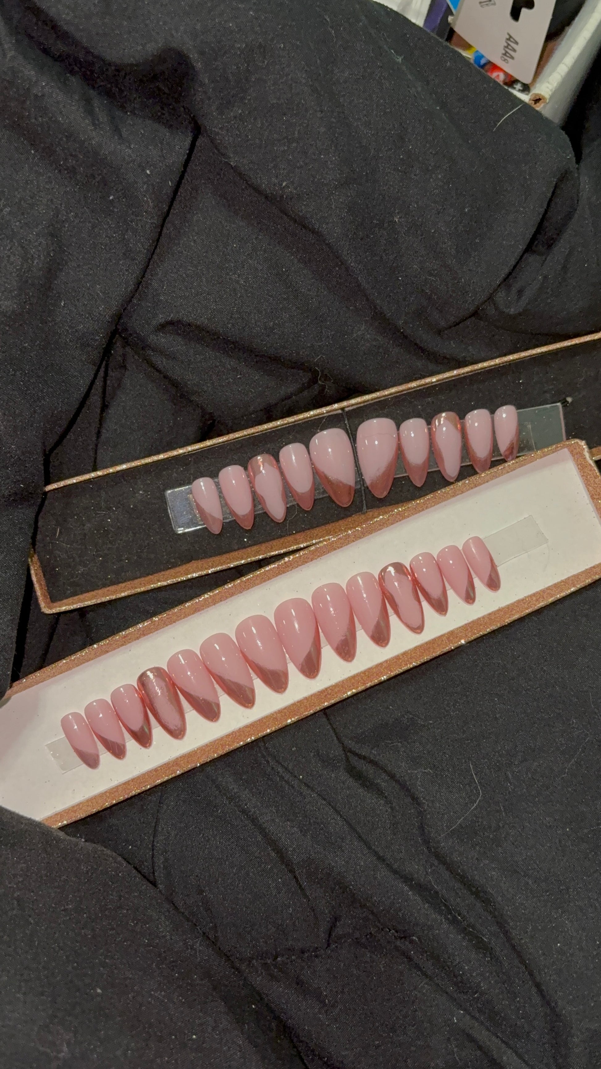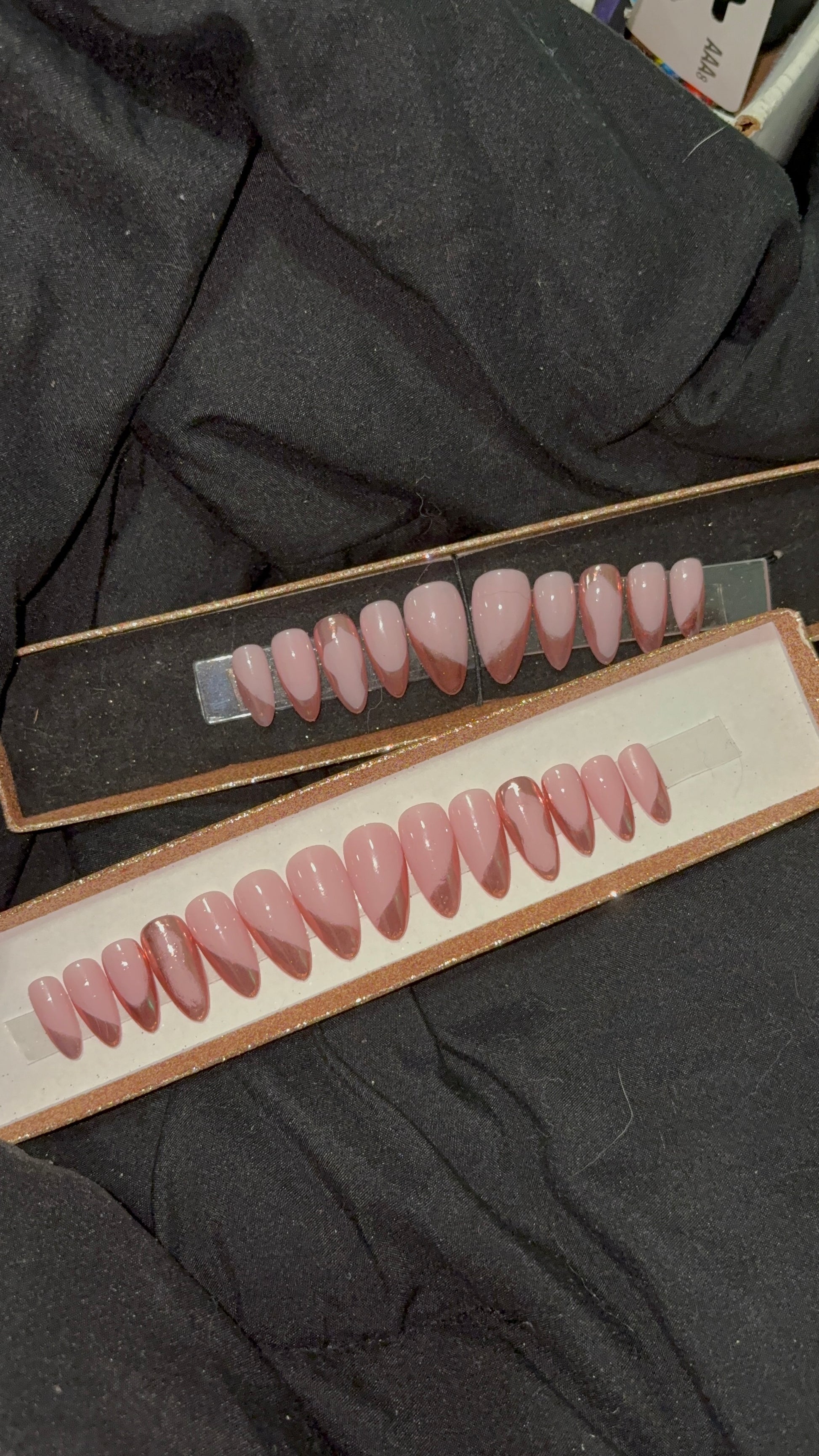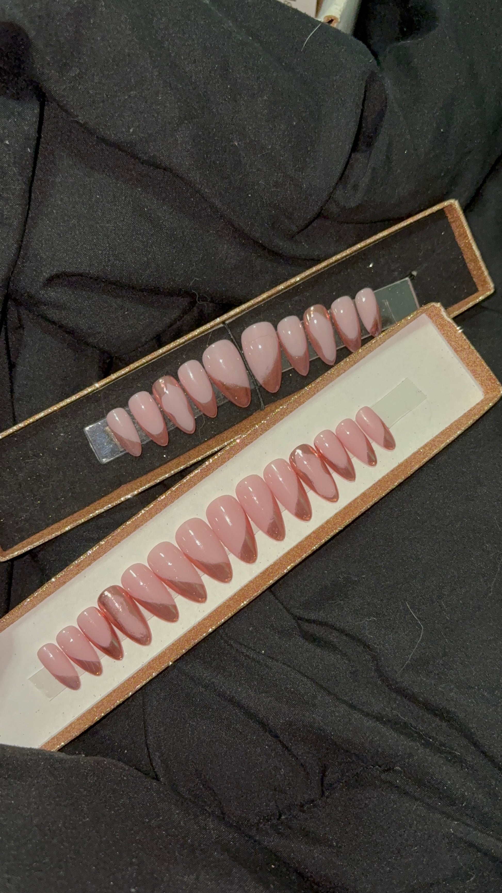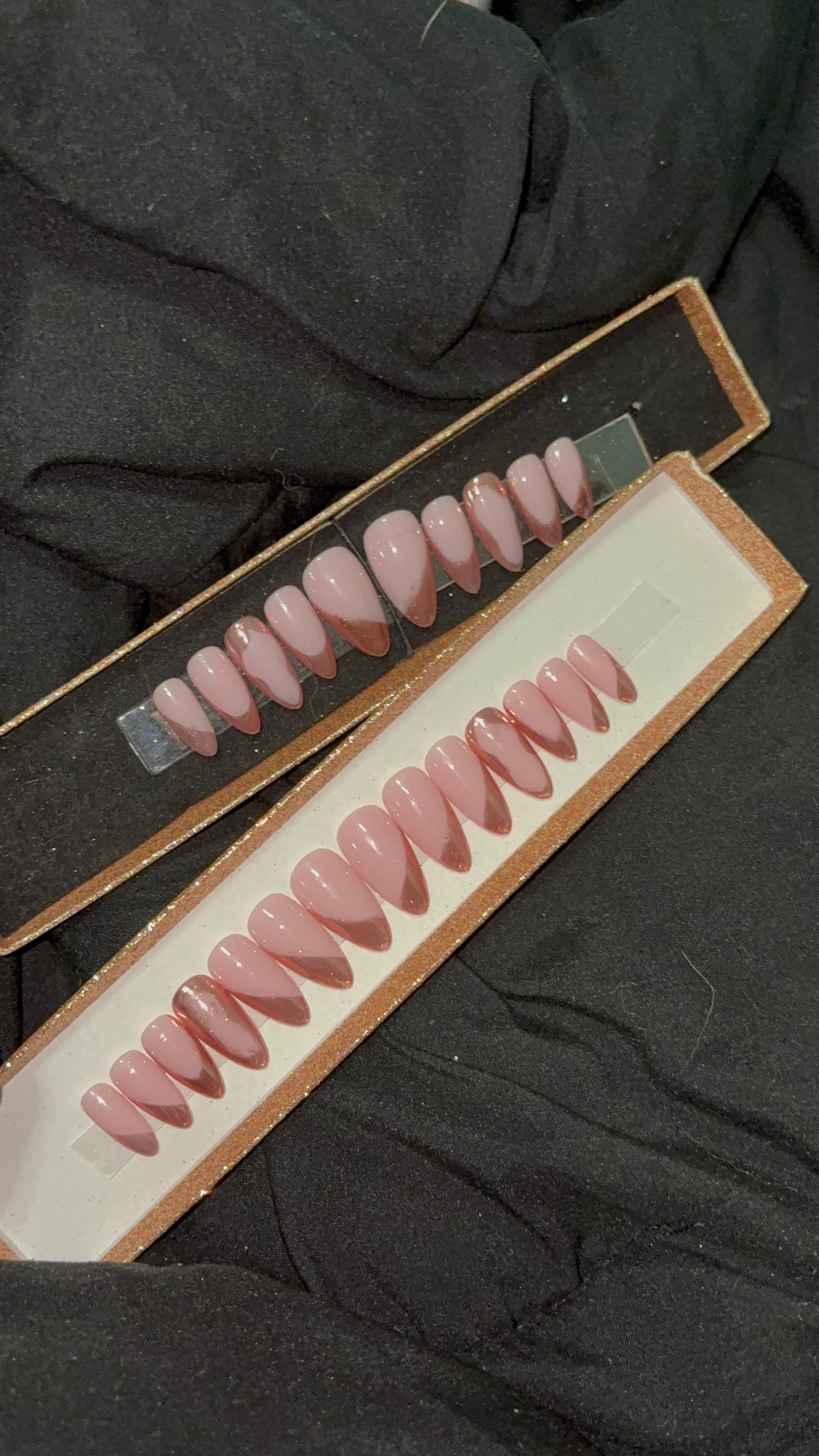 Elevate your look with these chic nude press-on nails featuring elegant rose gold French tips. Perfectly balanced between subtle and glamorous, this set adds a touch of sophistication to any outfit or occasion.